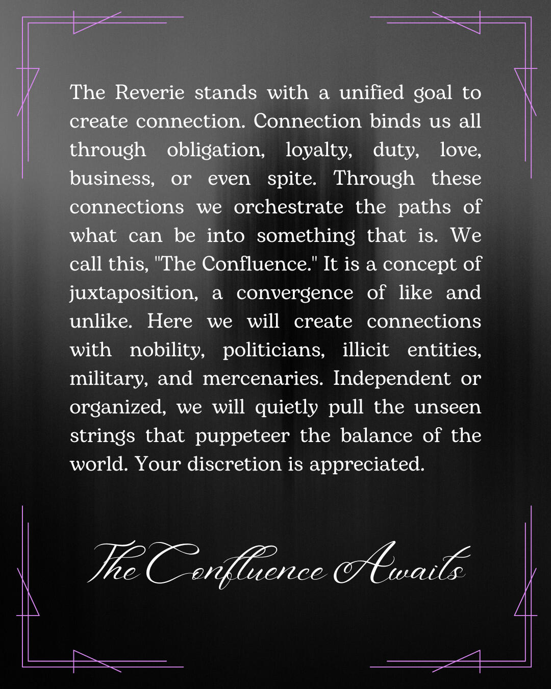 Amidst the glancing gaze of the observing masses, Demon's Reverie maintains the anodyne guise of a welcoming speakeasy. Keeping its doors open to any merely seeking respite in the eve of an arduous day, or for those looking to meld into the shadows of a quieted evening. The Reverie offers an array of exotic drinks, music, and enticing escorts to its patrons. However, underneath the gilded surface of the establishment lurks an immense hidden network of individuals dedicated to catching the vagrant dreams of those who desire change.