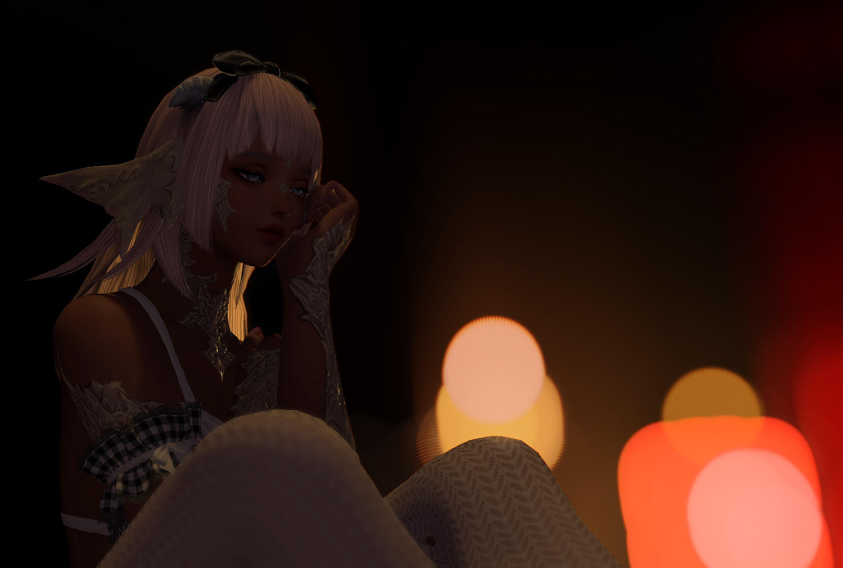 11th Day of the Third Astral Moon Rain collided with cobblestone under the lamplight of a dreary evening along the winding streets of Thanalan’s Goblet district. A soft amber glow radiated off the slick stone, illuminating the face of a tall au ra woman sporting inky black hair tied into a messy ponytail. The fur collar of her leather coat draped over her shoulders, soaked by the rain. She looked down the street, though her intrepid blind gaze remained unaffixed, her mind awash with a tempest of thought and a fleeting hope as if she were on borrowed time.